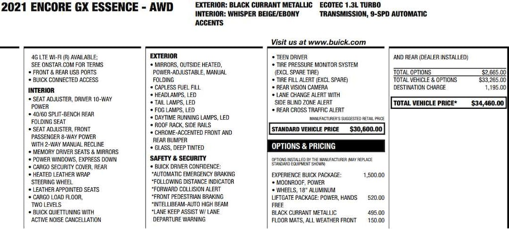 EXPERIENCE BUICK PACKAGE includes (C3U) power moonroof and (RQK) 18" Medium Android High Gloss wheels with chrome inserts, HANDS-FREE POWER LIFTGATE PACKAGE includes (TC2) Hands-free power liftgate, AUDIO SYSTEM, 8" DIAGONAL BUICK INFOTAINMENT SYSTEM includes multi-touch display, AM/FM stereo, Bluetooth® streaming audio for music and most phones and Wireless Apple CarPlay®/Wireless Android Auto® for compatible phones (STD), ENGINE, ECOTEC 1.3L TURBO (GM-estimated 155 hp [115 kW] @ 5,600 rpm / 174 lb-ft torque [236 Nm] @ 1,600 rpm FWD/AWD models) (STD), TRANSMISSION, 9-SPEED AUTOMATIC, 9T4X, GEN 1 (STD).